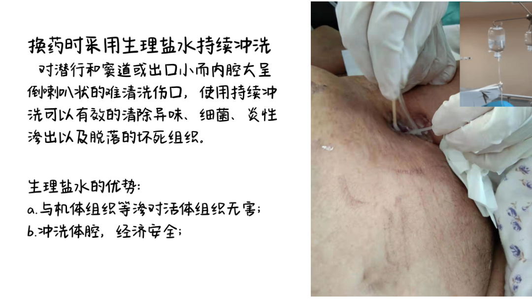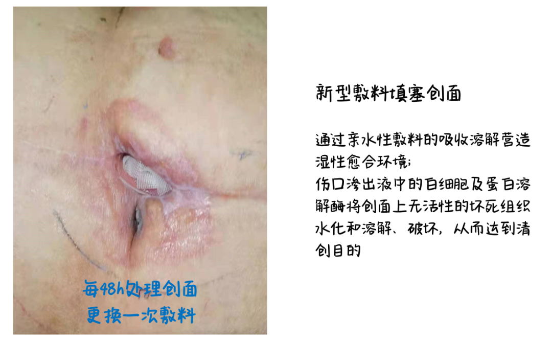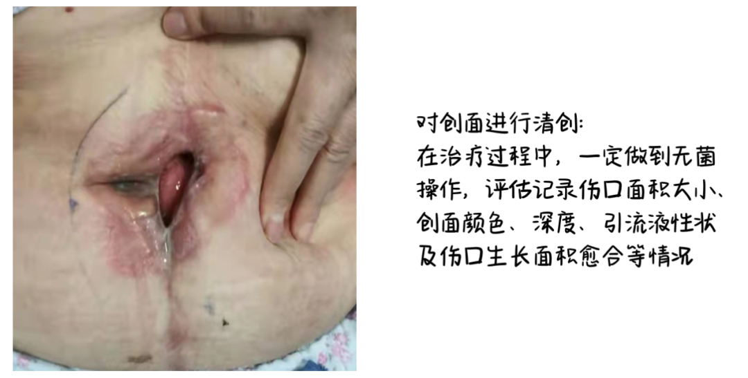 2021年10月28日,邵利萍带领伤口组开始干预其腹部慢性伤口,实施步骤分为清创、处理感染、新型敷料填塞、持续负压吸引: