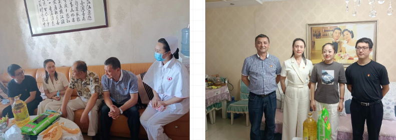 党支部书记徐菲莉、居来提•阿布都克热木在融鑫社区书记的带领下,分别来到华凌公寓、叶办小区和兴兴小区,慰问困难群众和老党员代表。“身体状况如何?生活上有哪些困难?”两位党支部书记悉心了解老同志的生活困难和身体近况,向老党员宣传健康保健知识,并送去慰问品。本次活动共慰问5名党员群众代表。