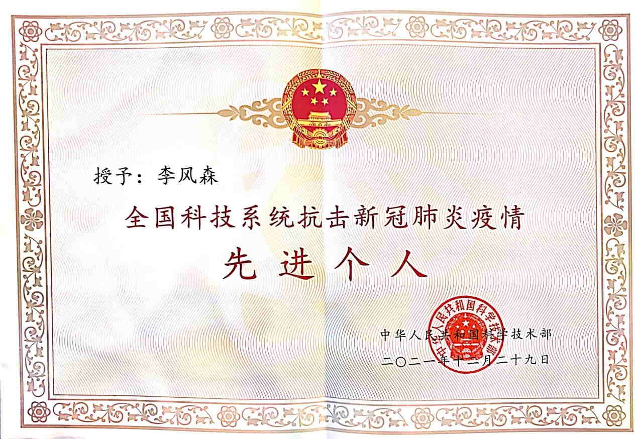 3.发现新冠不单有“湿”,还有“燥热伤津而肺病”的特点。临床发现在新疆、内蒙等西北地区,新冠肺炎 “湿”的临床特点并不明显,轻型、普通型患者反而常出现“燥邪伤肺”临床表现,因此新冠治疗不但要重视“湿”,更要重视“燥”,因此提出西北新冠肺炎的特殊证型“燥邪伤肺”证,获得专家认可,并受国家中医药管理局邀请,修订《新型冠状病毒肺炎诊疗方案(试行第八版 修订版)》纳入此证。基于此结合患者临床证候及演变规律,提出“益气养阴,清热化湿”法并拟定了新冠预防、治疗和康复的三个处方,申报获批为院内制剂,并申报国家发明专利。其中新疆新冠“1号方(参麦宁肺合剂)” 生产并发放38万余剂,在新疆新冠疫情防控中起到了显著的作用。通过真实世界研究发现,参麦宁肺合剂抑制炎症介质释放,避免炎症风暴的产生,从而达到治疗新冠肺炎的目的。目前该药已经进行新药的临床前研究。李风森主任医师还主持制定新疆《新型冠状病毒感染的肺炎重症中医药治疗指导方案》及《新型冠状病毒感染无症状感染者诊疗方案》,主持2020年新疆公共卫生关键技术研发与防疫体系建设项目。疫情发生以来,李风森主任医师先后转战于新疆、内蒙古等省市指导疫情防控工作,并于2020年3月以副领队身份前往巴基斯坦开展抗疫指导工作,分享中国抗疫经验,为巴基斯坦不断完善疫情防控体系建设、提升筛查检测能力等提供有效帮助,其学术思想和专业技能得到了国家卫健委和外交部的好评。先后获得全国科技系统抗击新冠疫情先进个人、援外先进个人、新疆维吾尔自治区优秀共产党员,先进工作者,第四届全国“白求恩式好医生”,中华中医药学会通报表扬抗疫个人、新疆“最美科技工作者”等荣誉称号。