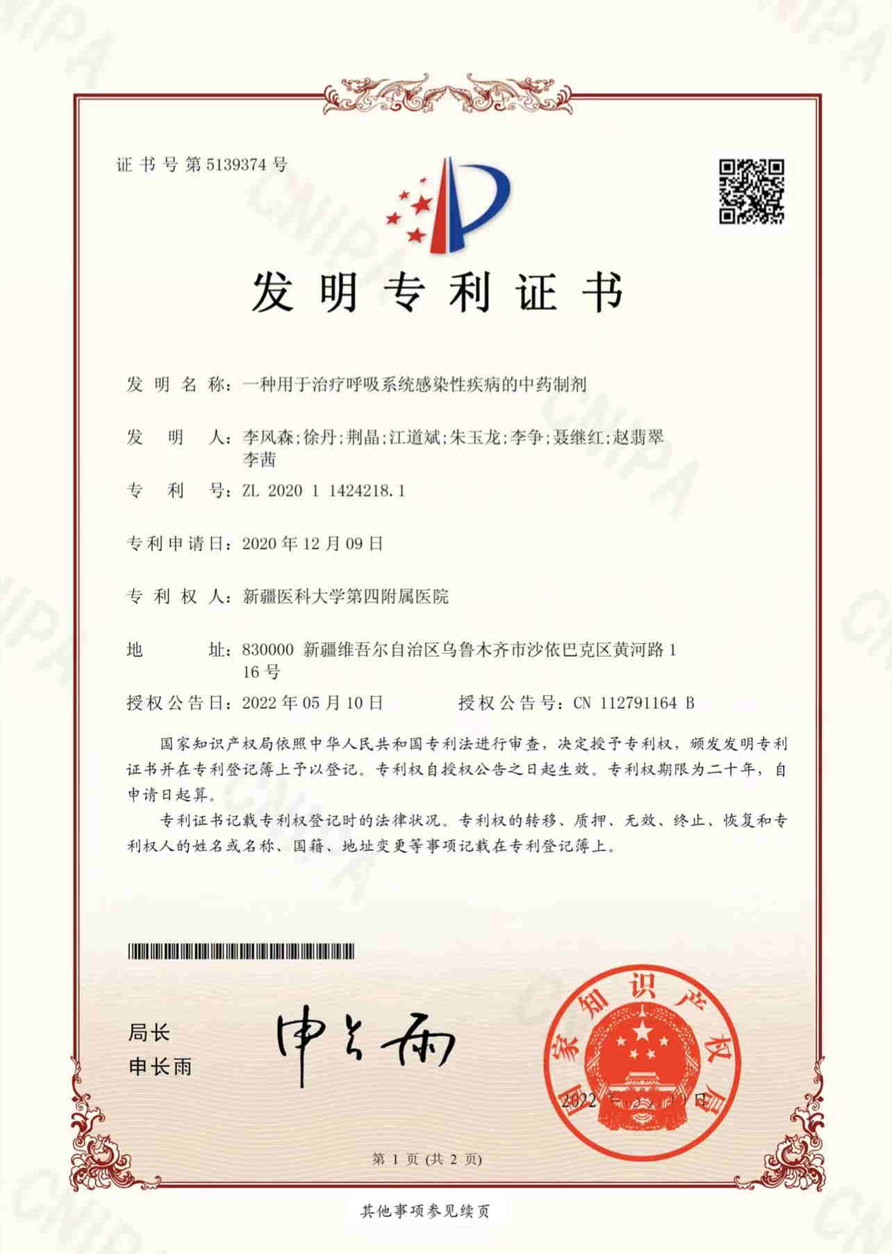 李风森教授发现新冠不单有“湿”,还有“燥热伤津致肺病”的特点。临床发现在新疆、内蒙等西北地区,新冠肺炎 “湿”的临床特点并不明显,轻型、普通型患者反而常出现“燥邪伤肺”临床表现,因此新冠治疗不但要重视“湿”,更要重视“燥”,因此提出西北新冠肺炎的特殊证型“燥邪伤肺”证,获得专家认可,并受国家中医药管理局邀请,修订《新型冠状病毒肺炎诊疗方案(试行第八版 修订版)》纳入此证。基于此结合患者临床证候及演变规律,提出“益气养阴,清热化湿”法并拟定了新冠预防、治疗和康复的三个处方,申报获批为院内制剂,并申报国家发明专利。其中新疆新冠“1号方(参麦宁肺合剂)” 生产并发放38万余剂,在新疆新冠疫情防控中起到了显著的作用。通过真实世界研究发现,参麦宁肺合剂抑制炎症介质释放,避免炎症风暴的产生,从而达到治疗新冠肺炎的目的。目前该药已经进行新药的临床前研究。李风森主任医师还主持制定新疆《新型冠状病毒感染的肺炎重症中医药治疗指导方案》及《新型冠状病毒感染无症状感染者诊疗方案》,主持2020年新疆公共卫生关键技术研发与防疫体系建设项目。疫情发生以来,李风森主任医师先后转战于新疆、内蒙古等省市指导疫情防控工作,并于2020年3月以副领队身份前往巴基斯坦开展抗疫指导工作,分享中国抗疫经验,为巴基斯坦不断完善疫情防控体系建设、提升筛查检测能力等提供有效帮助,其学术思想和专业技能得到了国家卫健委和外交部的好评。先后获得全国科技系统抗击新冠疫情先进个人、援外先进个人、新疆维吾尔自治区优秀共产党员,先进工作者,第四届全国“白求恩式好医生”,中华中医药学会通报表扬抗疫个人、新疆“最美科技工作者”等荣誉称号。