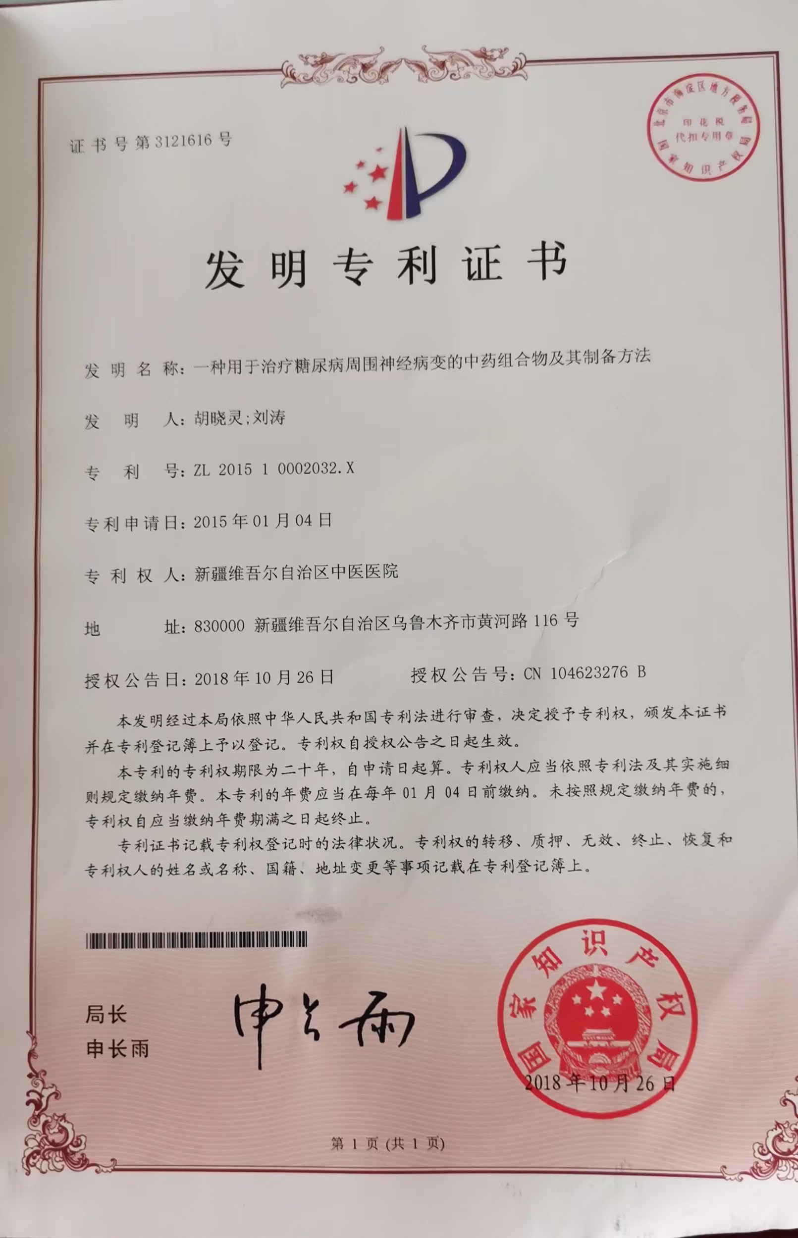 胡晓灵,刘涛,一种用于治疗糖尿病周围神经病变中药组合物及其制备方法,国家专利。