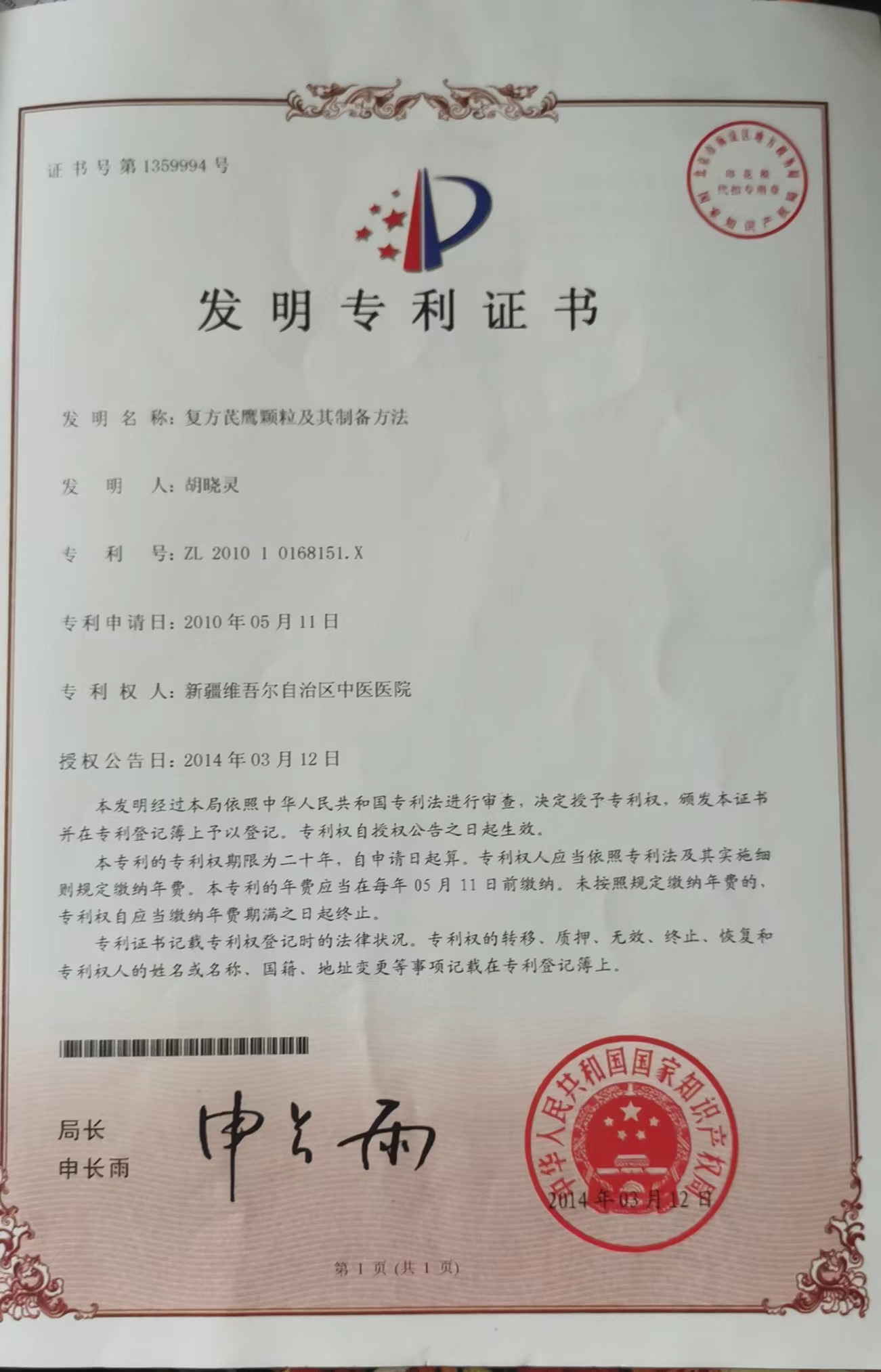 胡晓灵,复方芪鹰颗粒及其制备方法,国家专利。