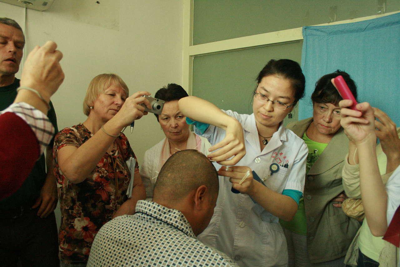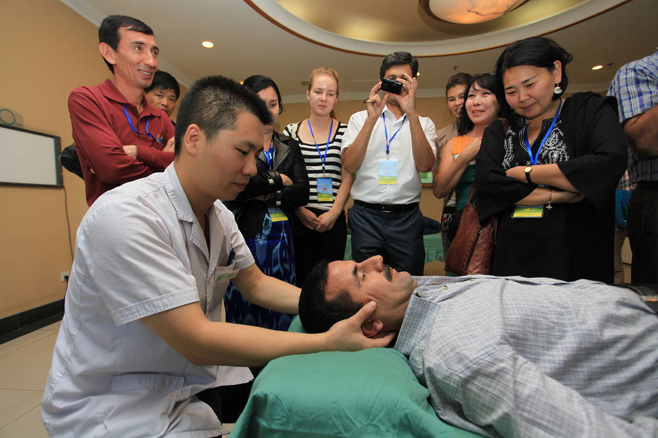 Профессор Лю Хунся, заведующая отделением дерматологии, выступила с демонстрацией техники метода наружной обработки кожи - огнетерапии перед должностными лицами Северной Европы.