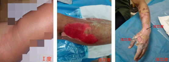 一度烫伤(红斑性):伤及表皮,生发层无损伤,局部红斑,轻度炎症反应(红、肿、热、痛)无水泡,干燥,无感染,3-5日好转痊愈,脱屑后无瘢痕。