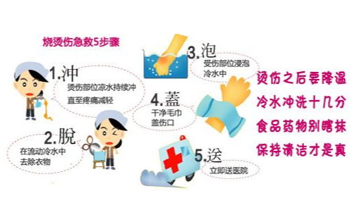 烫伤急救的时候,谨记“冲、脱、泡、盖、送”五字要诀。