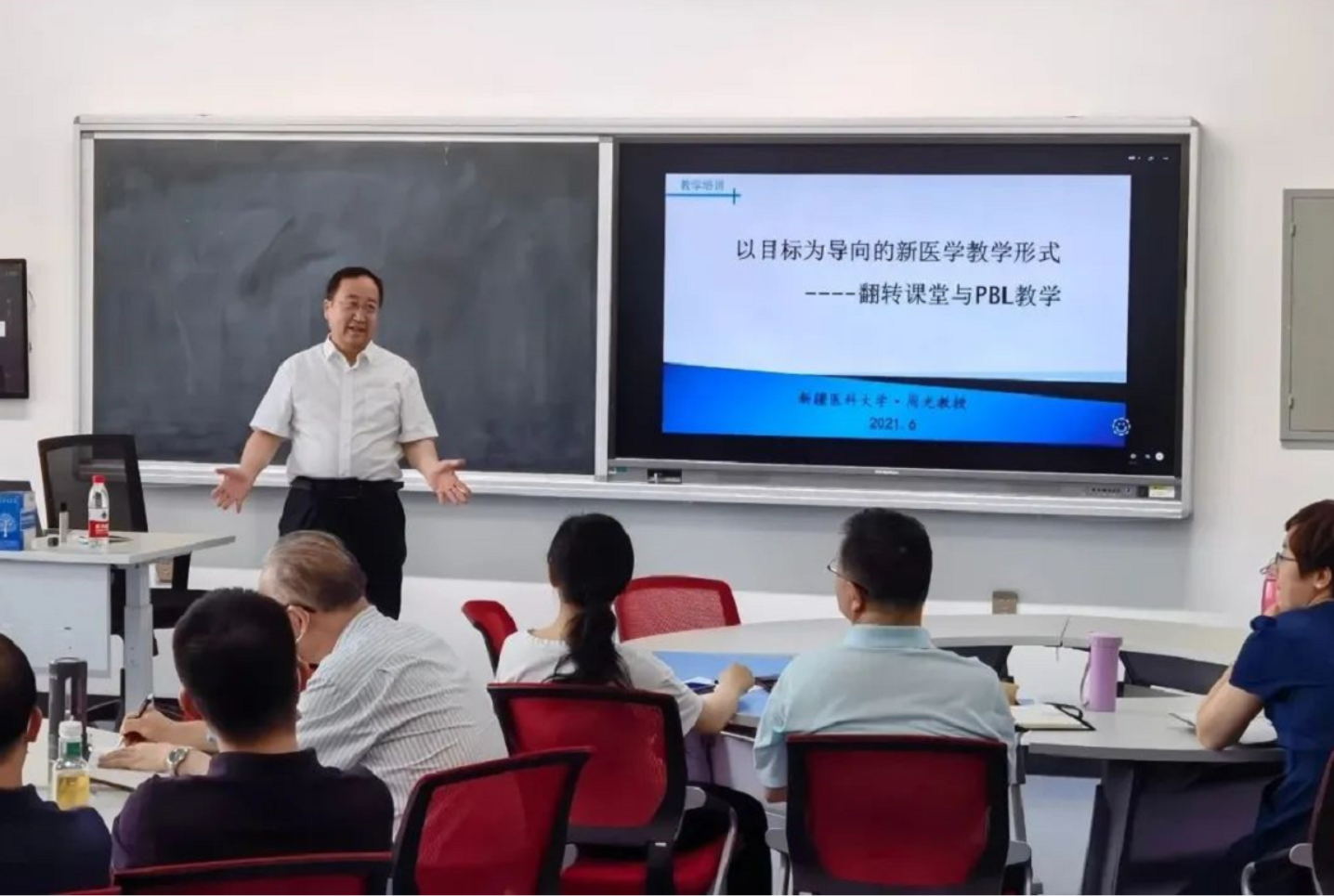 2021年6月9日下午,学院“2021年教学骨干师资培训班”在新疆医科大学雪莲山校区多屏互动教室顺利开班,新疆医科大学“以本为本、四个回归”校级教学名师、中医外科教研室主任周光教授为教师们上了开班第一课——《以目标为导向的新医学教学形式——翻转课堂与PBL教学设计与实现》教学专项培训,我院教研室主任、秘书、骨干教师、教学管理人员共30余人参加了此次培训。