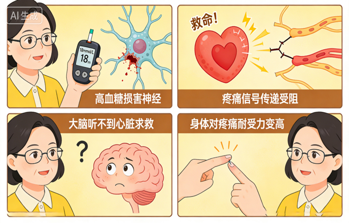 我们可以把身体的神经想象成遍布全身的“电线”。长期控制不佳的高血糖,就像一种强腐蚀剂,会慢慢损伤这些“电线”的绝缘层,尤其是那些传递痛觉的细小的“电线”。这个过程,医学上称为“糖尿病神经病变”。普通人的心脏报警:血管堵了→心脏发出疼痛信号(通过神经这条电线)→大脑收到信号→感到胸痛,赶紧停下休息或去医院。糖尿病患者的“无声”报警:血管堵了→心脏发出疼痛信号→但传递信号的神经“电线”被高血糖腐蚀损坏了→大脑收不到明确信号→感觉不到痛!结果就是,心脏明明已经严重缺血,甚至发生心肌梗死,但患者本人却毫无察觉,或只感到一些不相关的轻微不适。因为没有“疼痛”这个红灯警报,患者不会停下休息,更不会去医院,导致心脏在“无声”中持续受损。