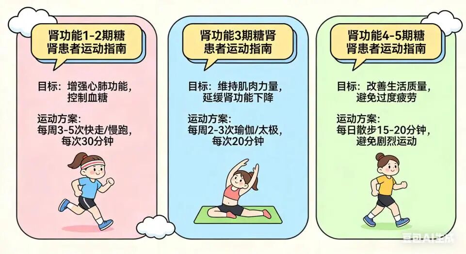 1.稳定血糖:运动能提高肌肉对胰岛素的敏感性,帮助消耗血糖,这是延缓肾脏损伤的根本。2.改善血压:运动有助于扩张血管,降低系统性的高血压,从而减轻肾小球内部的压力。3.减轻炎症:运动能降低体内的氧化应激和炎症水平,而这些正是破坏肾小球的“元凶”之一。下面这份分阶段的运动指南,请务必收好。