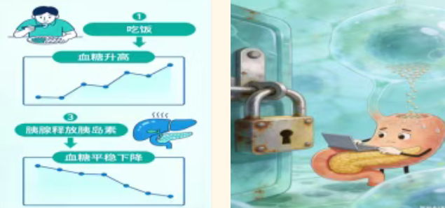 你吃饭→血糖升高→胰腺立刻派出一大批胰岛素(钥匙)→门打开→糖进入细胞→血糖降回正常,整个过程行云流水。