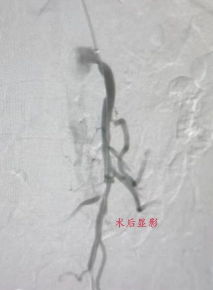 时间就是生命,鉴于患者高龄、基础病多,因传统开腹手术创伤大、风险高,术后并发症多,恢复时间较长。血管外科团队反复评估病情,与家属充分沟通后,决定采用微创介入手术治疗。科室迅速启动急诊手术绿色通道。术中,发现患者肠系膜上动脉起始处、距起始12cm处重度狭窄,15cm处完全闭塞,双侧肾动脉也有不同程度狭窄。随后,血管外科团队采用外周斑块切除系统清除肠系膜远端血栓,对重度狭窄处球囊扩张,操作精准、高效。术后造影显示,患者肠系膜上动脉管腔明显改善,血流量显著增加,无造影剂渗漏,手术成功,患者安返病房。