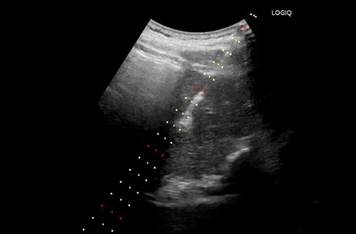 (超声引导下可见红色区域为肝内占位灶,黄色区域为伴行动脉)(超声引导下可见红色区域为肝内占位灶,黄色区域为伴行动脉)