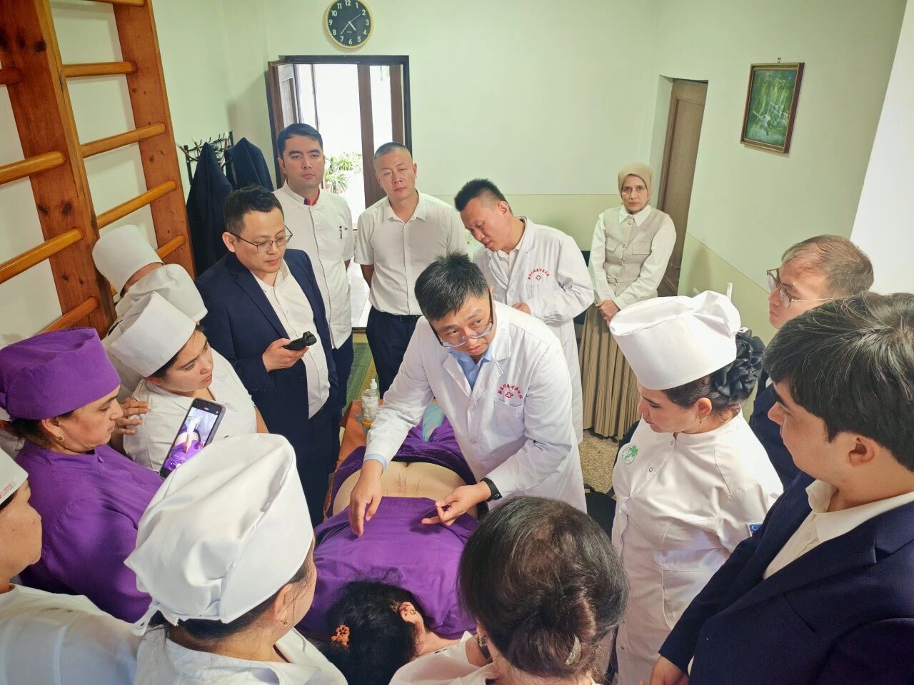 2025年10月23日新疆医科大学第四附属医院(自治区中医医院)副院长、江苏省人民医院援疆专家卞荣在乌兹别克斯坦国家创伤矫形与骨科医学科学中心康复科演示中医外治手法。