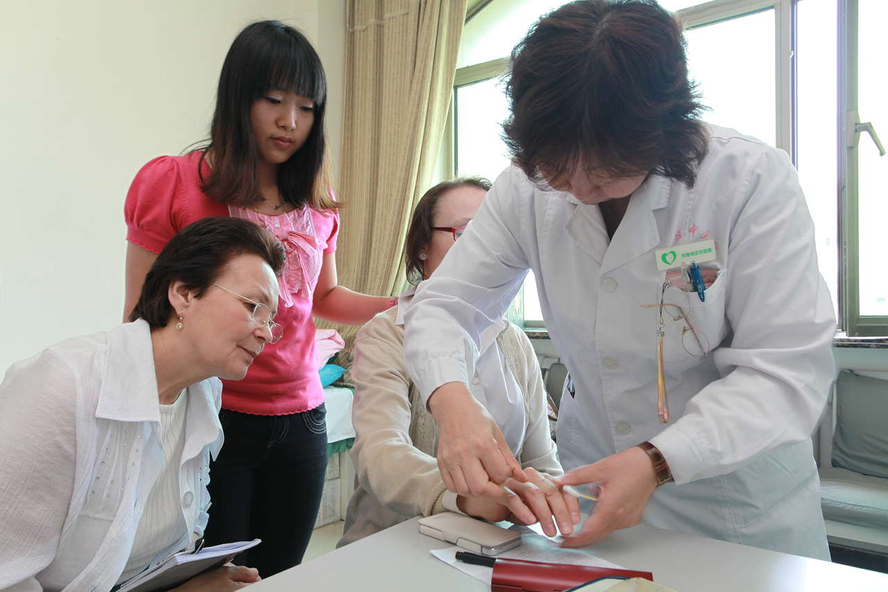 Профессор Лю Хунся, заведующая отделением дерматологии, выступила с демонстрацией техники метода наружной обработки кожи - огнетерапии перед должностными лицами Северной Европы.